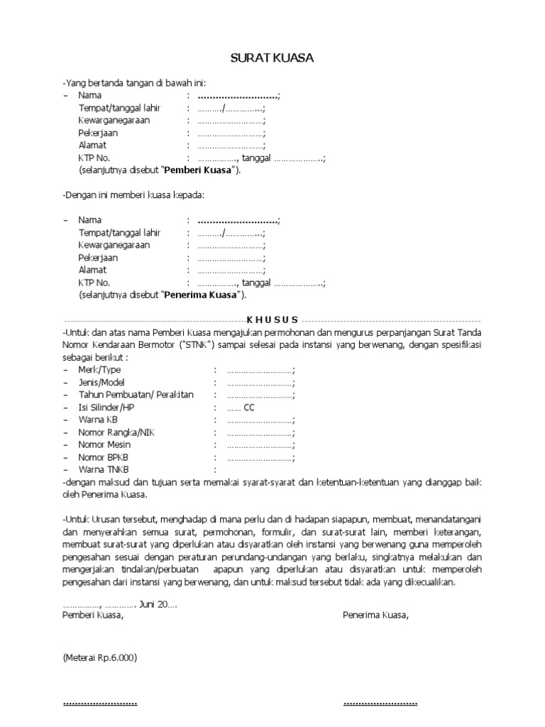 Surat Kuasa Pengurusan STNK Kendaraan - Format Surat from 3.bp.blogspot.com Surat tanda nomor kendaraan (stnk) adalah tanda bukti sah pendaftaran kendaraan bermotor berdasarkan kepemilikan yang terdaftar. Contoh surat kuasa perwakilan memang kerap kali dibutuhkan saat seorang tidak bisa melakukan secara langsung sebuah pekerjaan namun masih tetap menginginkan pekerjaan/suatu hal itu bisa tetap dapat dilakukan atau terwujud. Bukti kepemilikan kendaraan bermotor, atau bpkb adalah salah satu surat atau dokumen penting untuk kendaraan bermotor. Proses balik sebuahnama diperlukan apabila kami ingin merubah status kepemilikan sebuahbarang. Untuk pengurusan pembayaran pajak kendaraan sepeda motor dengan identitas sebagai berikut : Dengan menggunakan surat kuasa ini maka tidak akan ada keraguan terhadap si penerima kuasa. Surat yang menjadi bukti kepemilikan kendaraan bermotor seperti bpkb merupakan benda yang cukup penting. Simak contoh surat kuasa pengambilan bpkb di sini!
